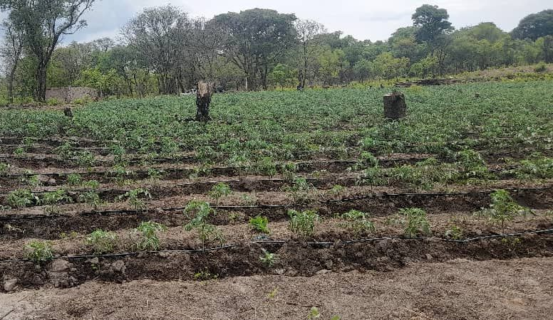 Work on installing the equipment to provide irrigation at the farm is now almost complete. The rain gun sprayers for the maize filed are fully operational, and the pipework for the vegetable filed is also working, though some more pipework is needed. The reservoir still awaits completion, and some security fencing is needed, not only to deter intruders, but also to keep livestock away from the crops. Tomatoes and cabbages are already growing successfully in the vegetable field, as can be seen here.